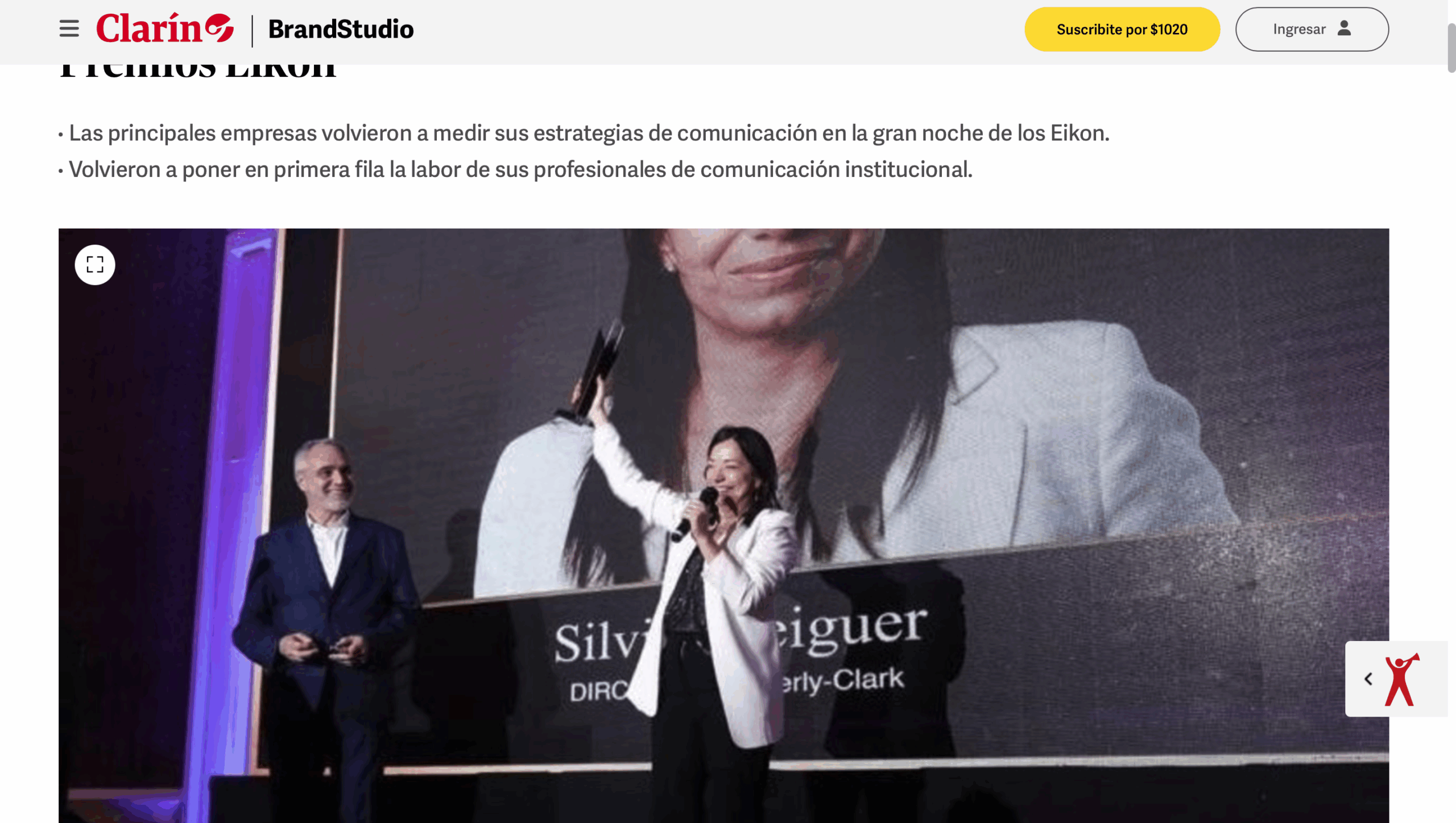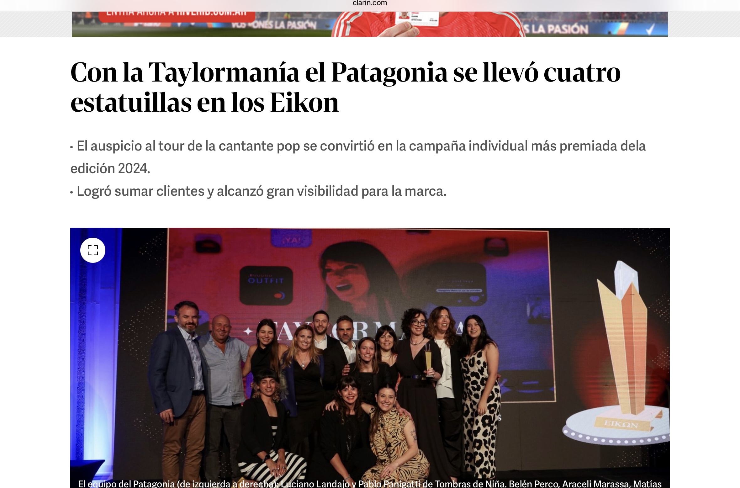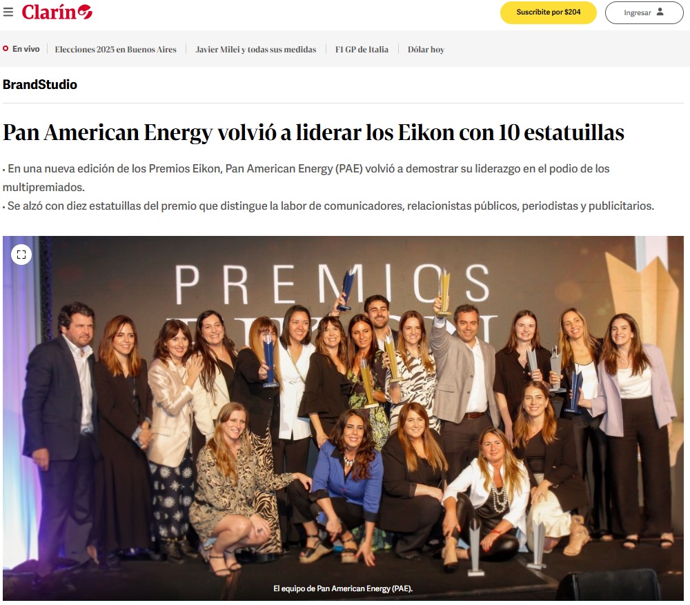 Eikon en Clarín Clarín obtuvo tres premios Eikon Premios Eikon: el Grupo Clarín ganó en cinco categorías El cambio climático estuvo en el centro de la última edición de los Premios Eikon Premiaron a las mejores campañas de comunicación institucional – Copy Con una fuerte apuesta a la diversidad, YPF se anotó entre los principales ganadores de los Eikon Premios Eikon 2023 Pan American Energy Las mejores campañas de comunicación institucional del año se darán cita para recibir sus premios Pan American Energy volvió a liderar los Eikon con 10 estatuillas Profertil, uno de los grandes ganadores de los Eikon 2024 Con la Taylormanía el Patagonia se llevó cuatro estatuillas en los Eikon Con Britney Spears, Norton se alzó con una estatuilla en los Eikon
