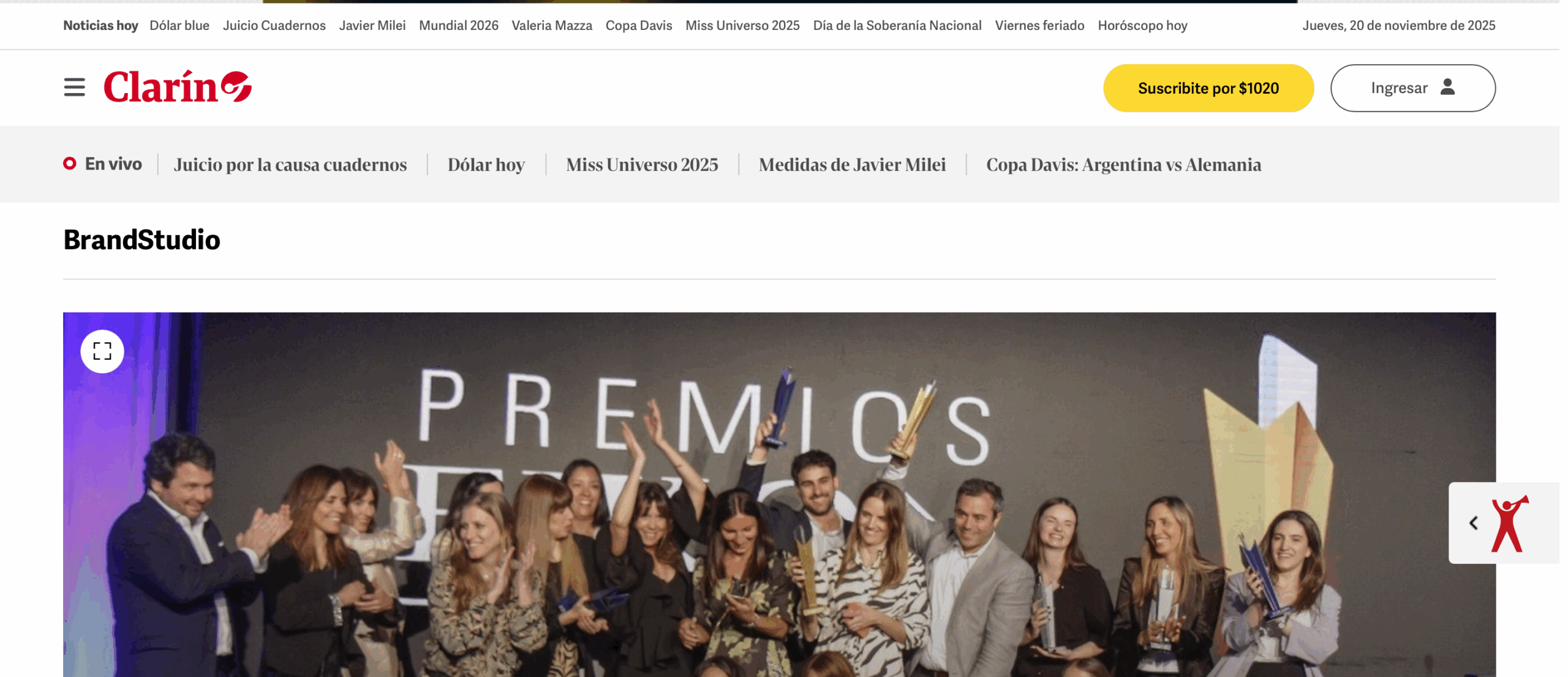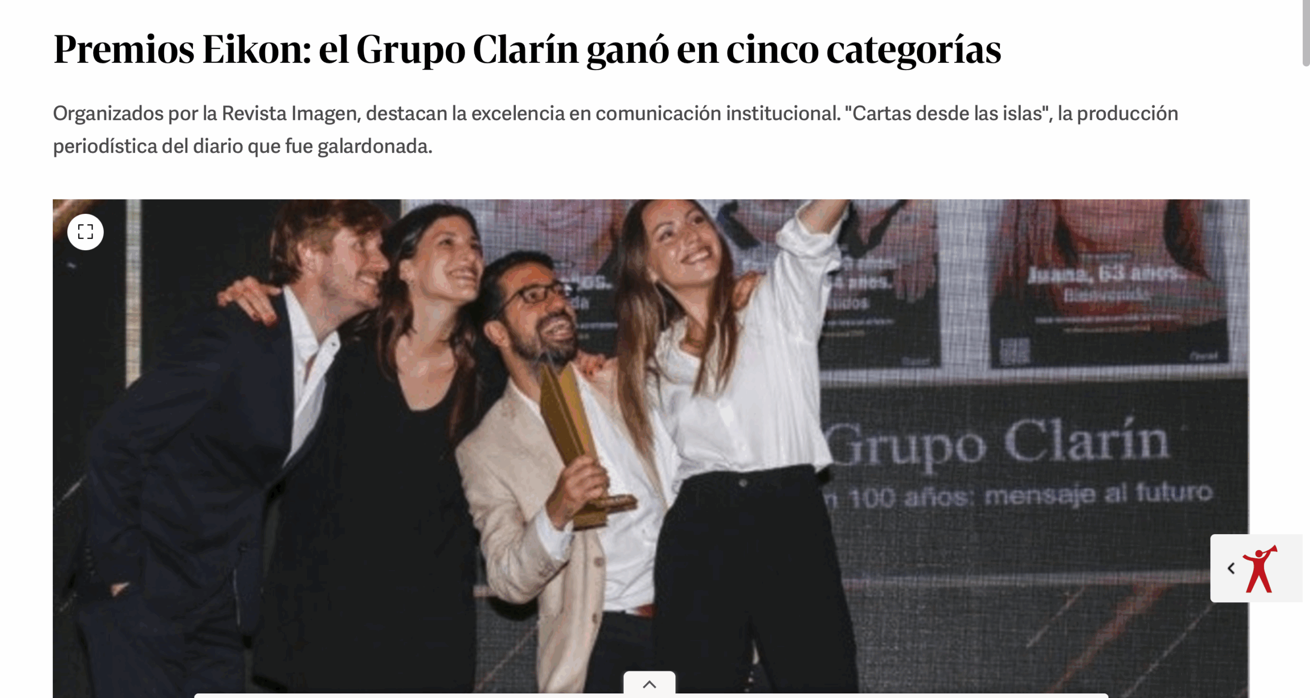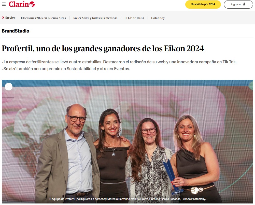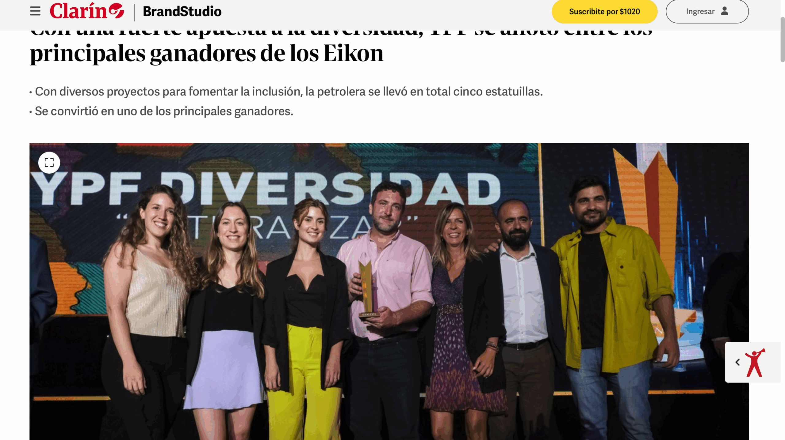 Eikon en Clarín Clarín obtuvo tres premios Eikon Premios Eikon: el Grupo Clarín ganó en cinco categorías El cambio climático estuvo en el centro de la última edición de los Premios Eikon Premiaron a las mejores campañas de comunicación institucional – Copy Con una fuerte apuesta a la diversidad, YPF se anotó entre los principales ganadores de los Eikon Premios Eikon 2023 Pan American Energy Las mejores campañas de comunicación institucional del año se darán cita para recibir sus premios Pan American Energy volvió a liderar los Eikon con 10 estatuillas Profertil, uno de los grandes ganadores de los Eikon 2024 Con la Taylormanía el Patagonia se llevó cuatro estatuillas en los Eikon Con Britney Spears, Norton se alzó con una estatuilla en los Eikon